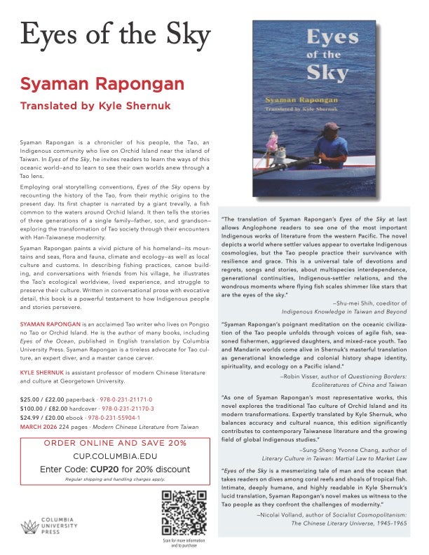 Syaman Rapongan is a chronicler of his people, the Tao, an Indigenous community who live on Orchid Island near the island of Taiwan. In Eyes of the Sky, he invites readers to learn the ways of this oceanic world—and to learn to see their own worlds anew through a Tao lens. Employing oral storytelling conventions, Eyes of the Sky opens by recounting the history of the Tao, from their mythic origins to the present day. Its first chapter is narrated by a giant trevally, a fish common to the waters around Orchid Island. It then tells the stories of three generations of a single family—father, son, and grandson—exploring the transformation of Tao society through their encounters with Han-Taiwanese modernity.