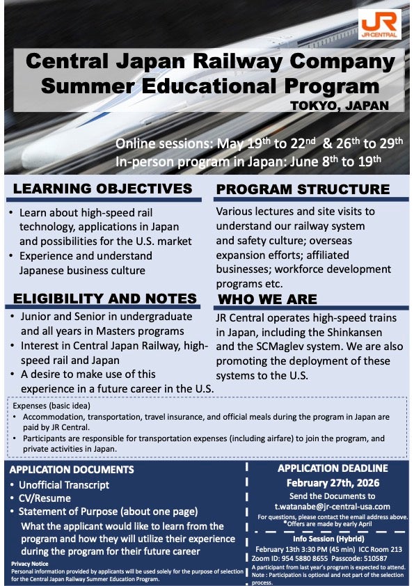 Join us for an information session on the Central Japan Railway (JR Central) Summer Educational Program on Friday, February 13, 2026, from 3:30–4:30 PM, in ICC 213. This will be a hybrid session, and participants may also join via Zoom .