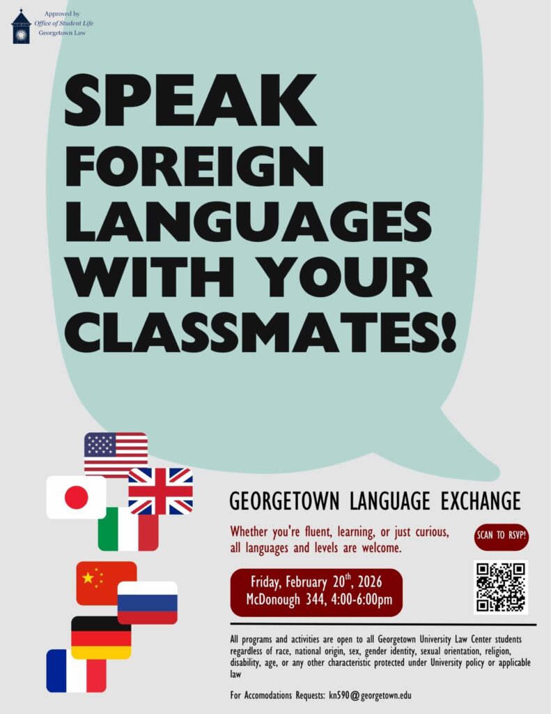 The Georgetown University Law Center is holding their next language exchange in McDonough 344 on the law campus this upcoming Friday from 4-6 pm. It is open to undergraduates and graduate students and is a great opportunity to practice languages and meet students from different departments. There will also be food provided. See the flyer below for more information.